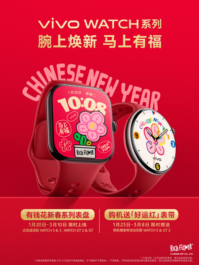 在1月20号-3月10号,vivo WATCH“有钱花”新春限定表盘将会限时上线,适配vivo WATCH 5&3、WATCH GT 2>几款手表。